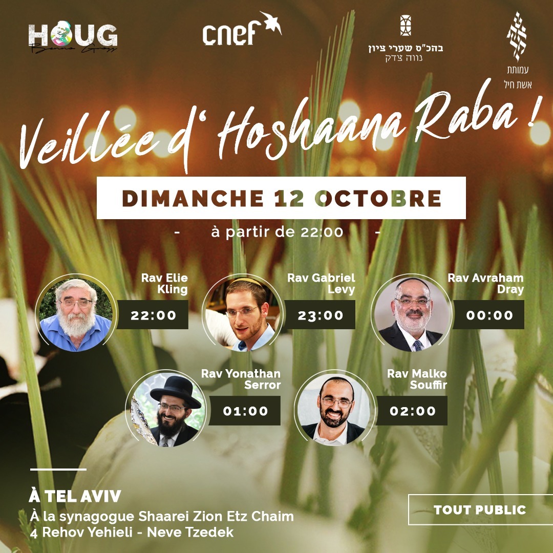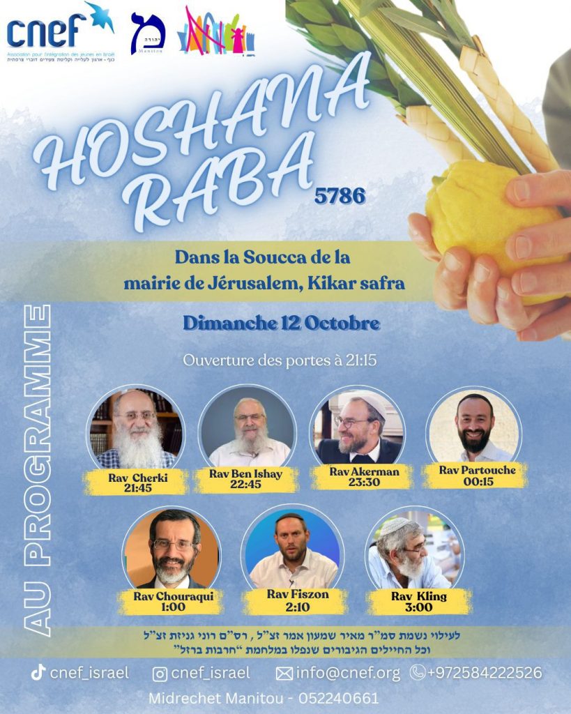 Les fêtes de Souccoth sont un peu à  part dans le sens où si elles durent 8 jours – comme Pessah ou Hanouka – les derniers jours sont plus animés que les premiers. En effet, l’avant dernière soirée, la veille de Simhat Torah, est généralement consacrée à une série d’étude qui se prolonge toute la nuit. Cette année, Hoshana Rabba a lieu le dimanche 12 octobre 2025 en soirée. Puis à la fin de Simhat Torah, la fête reprend pour une dernière soirée de musique et de danse, appelée les Akafot Shniot qui auront lieu le mardi 14 octobre 2025.