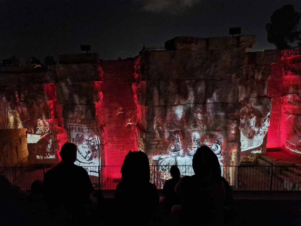 Une estrade a été installée entre ces murs pour accueillir du public et voir le Son et Lumière. Sur plusieurs de ces murs est projeté un film qui retrace la vie des Juifs depuis la destruction du Second Temple et l’exil, jusqu’à la veille de la Shoah. On y découvre comment les Juifs se sont fait une place dans la société avant 1939, et cela dans différents pays. La vie des Juifs en Europe et en Afrique du Nord avant la Shoah est retracée par le biais de témoignages. Pour la France, on suit une famille juive de Belfort. Puis le film s’arrête très brusquement. On pense d’abord à un problème technique. Mais non. Cela veut juste montrer que la vie de toutes ces communautés, souvent parfaitement intégrées dans leur pays, s’est brusquement interrompue avec la montée du nazisme.
