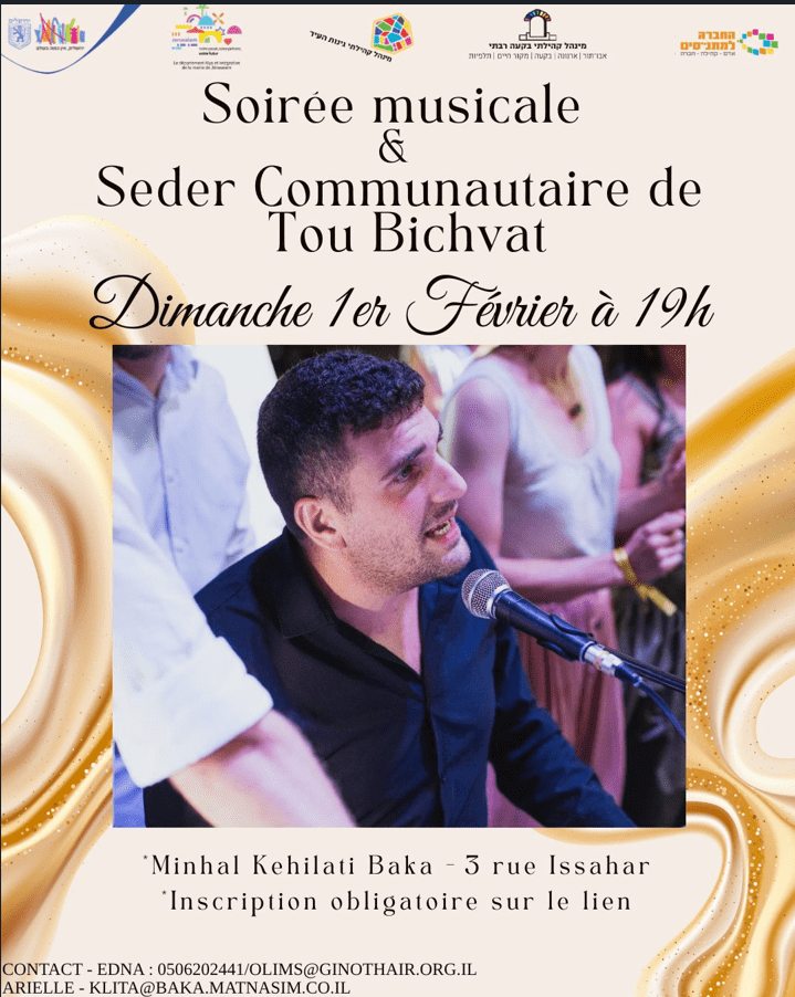 Le dimanche 1er février 2026 à partir de 19h, venez fêter Tu Bishvat en musique au Minhal Kehilati de Baka. Chacun apporte un fruit coupé et une boisson et la partie musicale est assurée par David Sabbah.