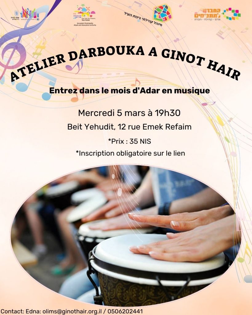 Cette année, à l’approche de Pourim, nous vous proposons une soirée musicale ! Venez apprendre les rythmes de la Darbouka avec Sarah Halfon. Atelier réservé aux femmes.