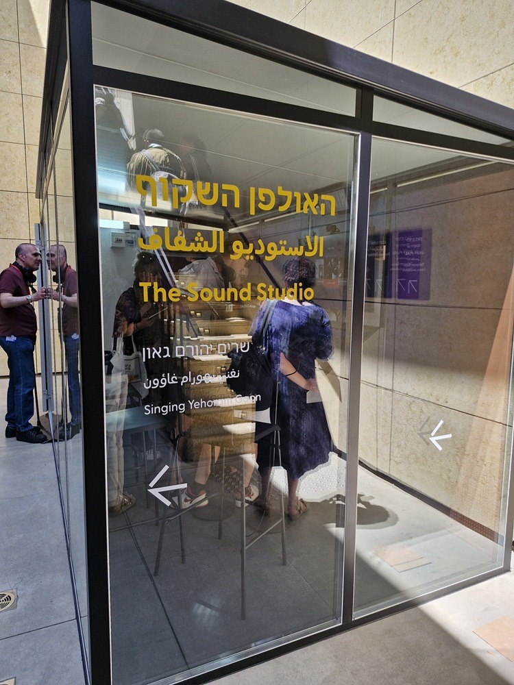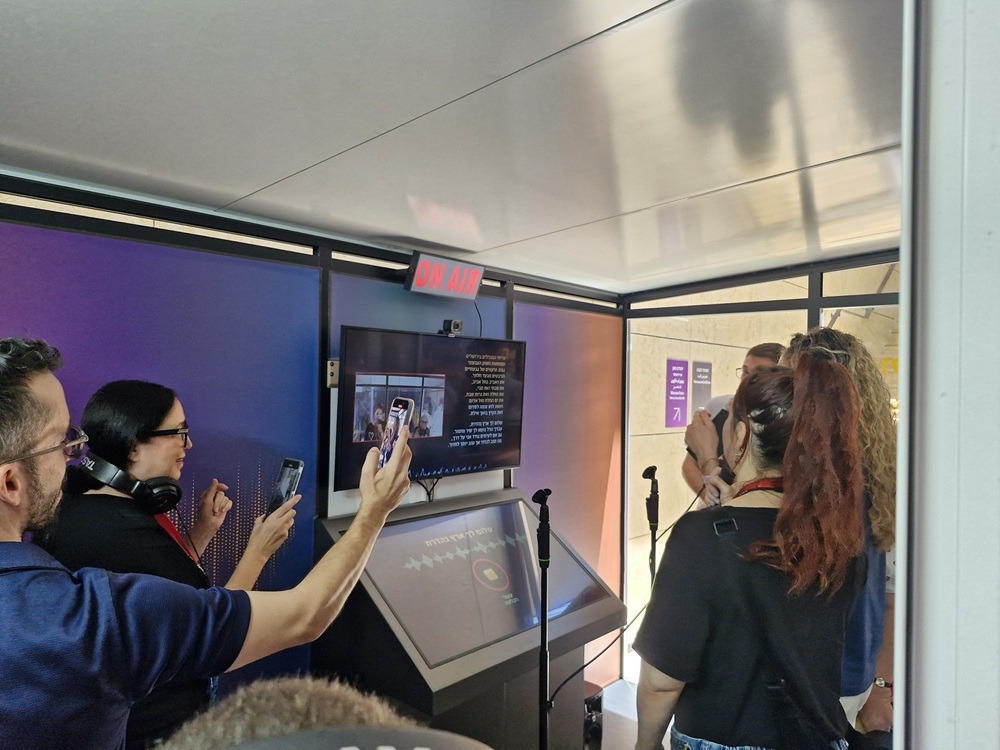 A la fin de cette partie de l’exposition, juste à la sortie, on trouve un studio d’enregistrement en verre avec 4 micros. Les artistes en herbe, et les autres, peuvent y chanter une chanson de Yehoram Gaon, dont les paroles passent sur l’écran comme dans un karaoké. Sachez qu’il est aussi possible de récupérer la vidéo de son interprétation sur son téléphone. Heureusement pour les autres visiteurs, le studio est phonétiquement conçu pour ne pas perturber ceux qui passent à proximité….
