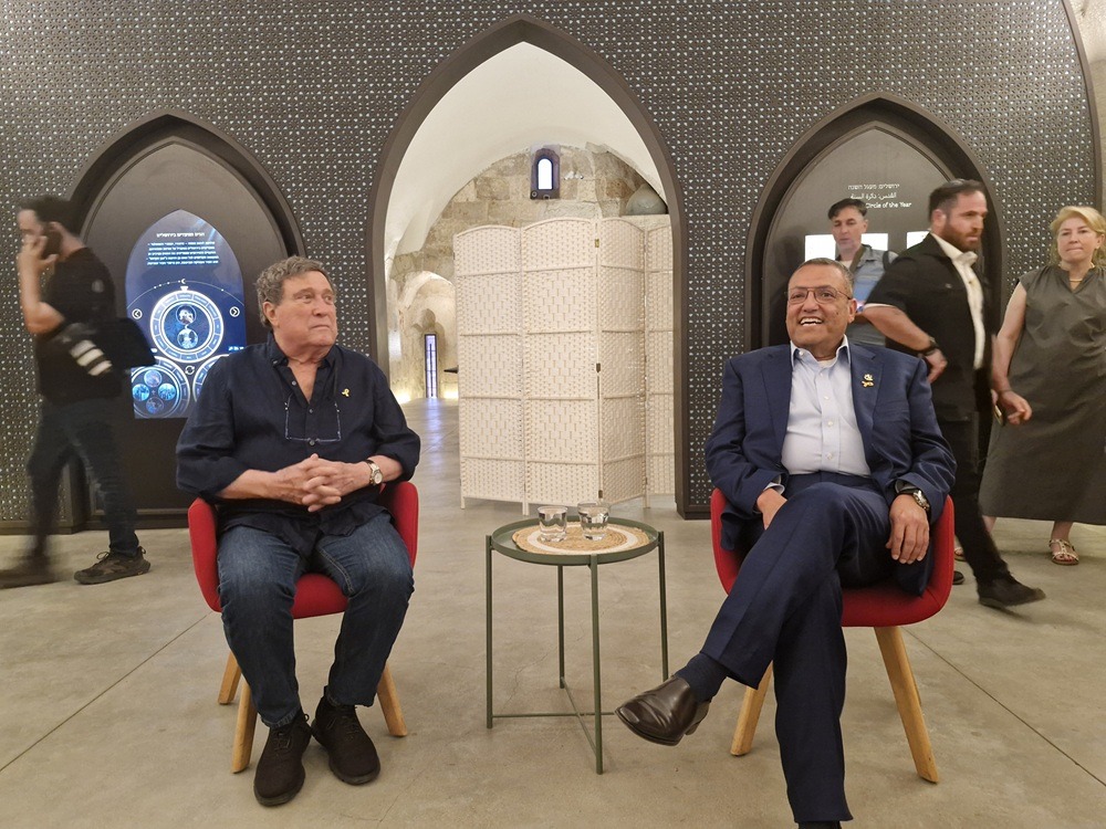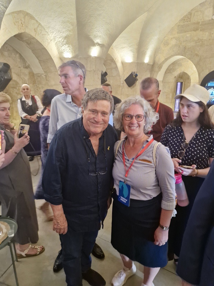 J’ai eu la chance, à la fin de ma visite, de rencontrer le maire de Jérusalem, Moshé Lion, et Yehoram Gaon, 2 amis de longue date Ce dernier a expliqué qu’il était très content et ému de cette exposition qui lui permettait d’exposer une partie de ses archives. Il a révélé aussi qu’il ne regardait que très rarement ses films ou des vidéos de lui. En effet, étant très perfectionniste, il lui est presque impossible de dire que ce qu’il a fait ou continue à faire est bien. Donc il préfère garder une distance avec ce qu’il fait. Mais il a également raconté que cette exposition lui a aussi posé un petit challenge auquel il n’avait pas pensé. Généralement quand il reçoit un prix – comme le Prix d’Israël qu’il reçoit en 2004 – il base son discours sur celui de ses prédécesseurs, un espèce de copier-coller avec des notes plus personnelles. Mais dans le cas de l’inauguration de cette exposition – qui a eu lieu quelques heures après cette visite – il n’avait pas de quoi s’inspirer, car il est très rare pour une personne d’avoir le privilège d’une exposition de son vivant…. Je ne me fais toutefois pas de soucis, il a dû bien s’en tirer.